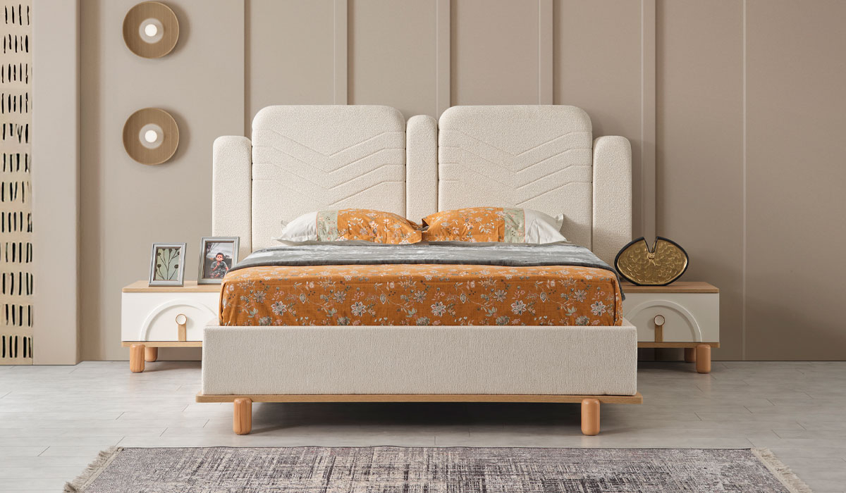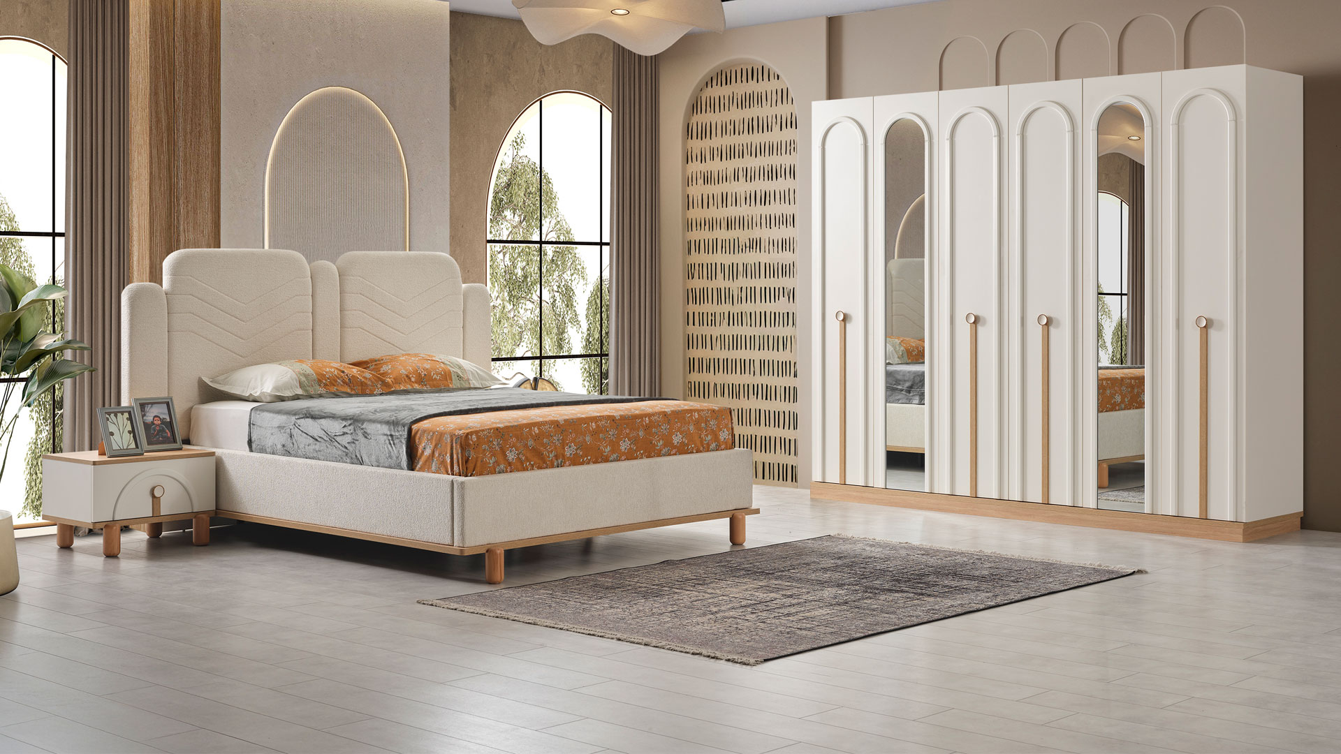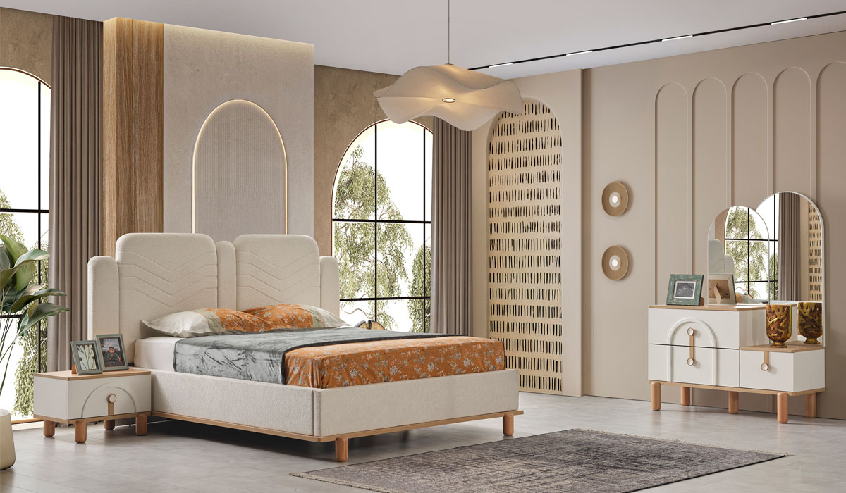 Özel dikiş uygulamalı başlığı ile dikkat çeken BAHAR YATAK ODASI, tasarım detaylarıyla bulunduğu mekanlarda şık ve doğal bir atmosfer yaratıyor. Farklı ölçü alternatifleri sayesinde fonksiyonel bir kullanım sunuyor.
