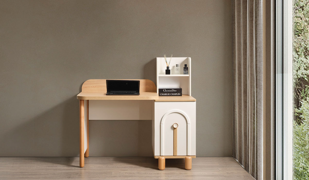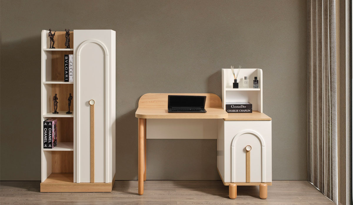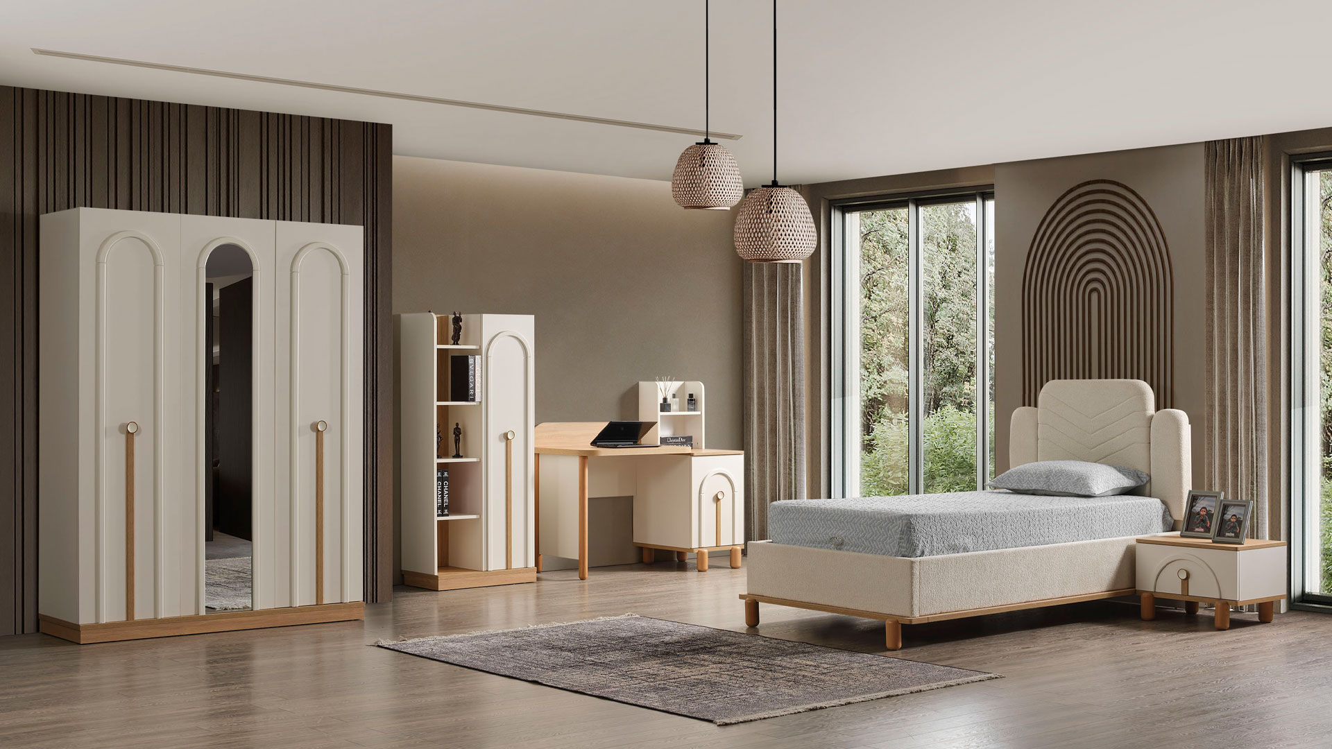 GONCA GENÇ ODASI, gençlerin yoğun çalışma saatleri için ihtiyaçları olan düzeni ve rahatlığı sunan kitaplık ve çalışma masası modülleri ile konfor odaklı dinamik tasarımını tamamlıyor.
