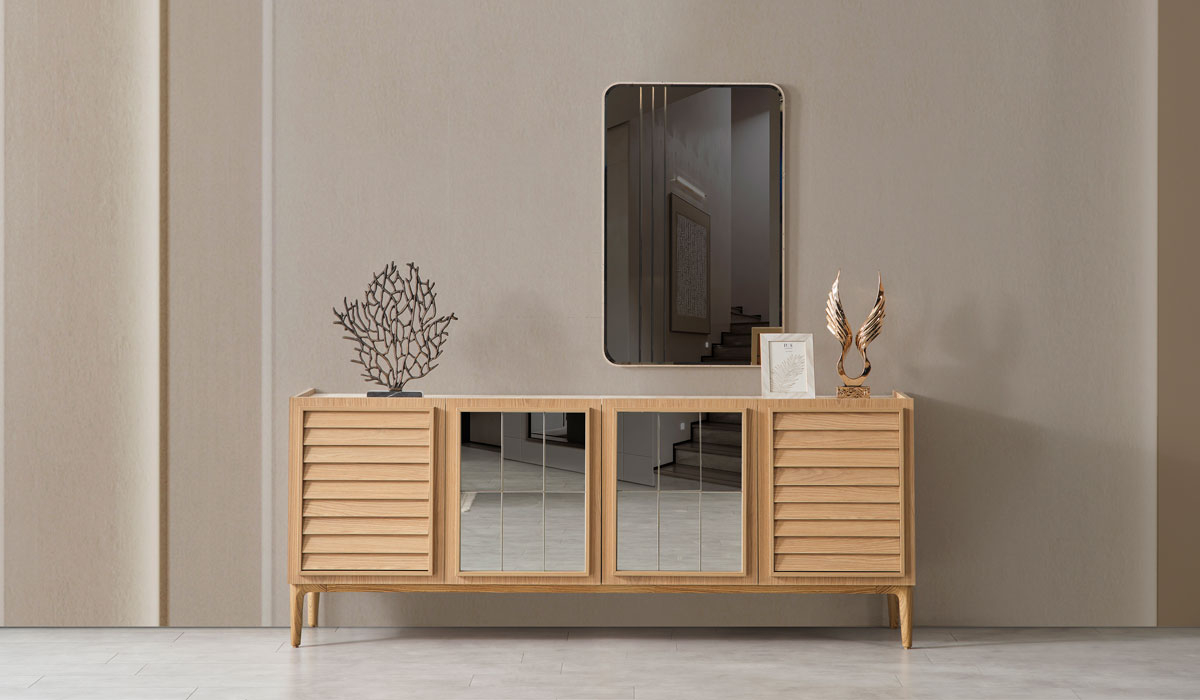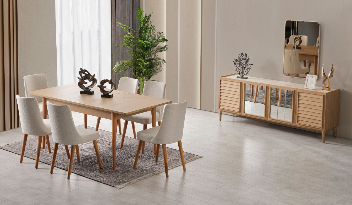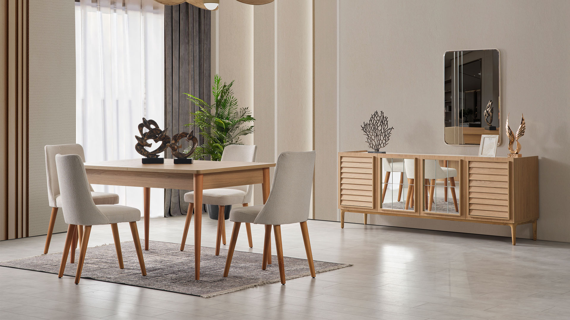 HELEN YEMEK ODASI, çağdaş tasarımı, doğal ve yalın görünümü, işçilikli detayları ile öne çıkıyor. Açık meşe ile renk kombinasyonunun bir arada sunulduğu HELEN YEMEK ODASI, tekstil dokulu yüzey detayları sıcak bir atmosfer katıyor. Kulpsuz tasarım uygulamasıyla yalın bir etki yaratan set, ayna alternatifi sunarak tasarım özgürlüğü tanıyor.