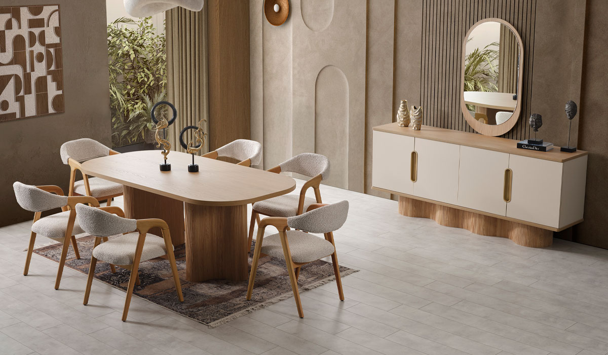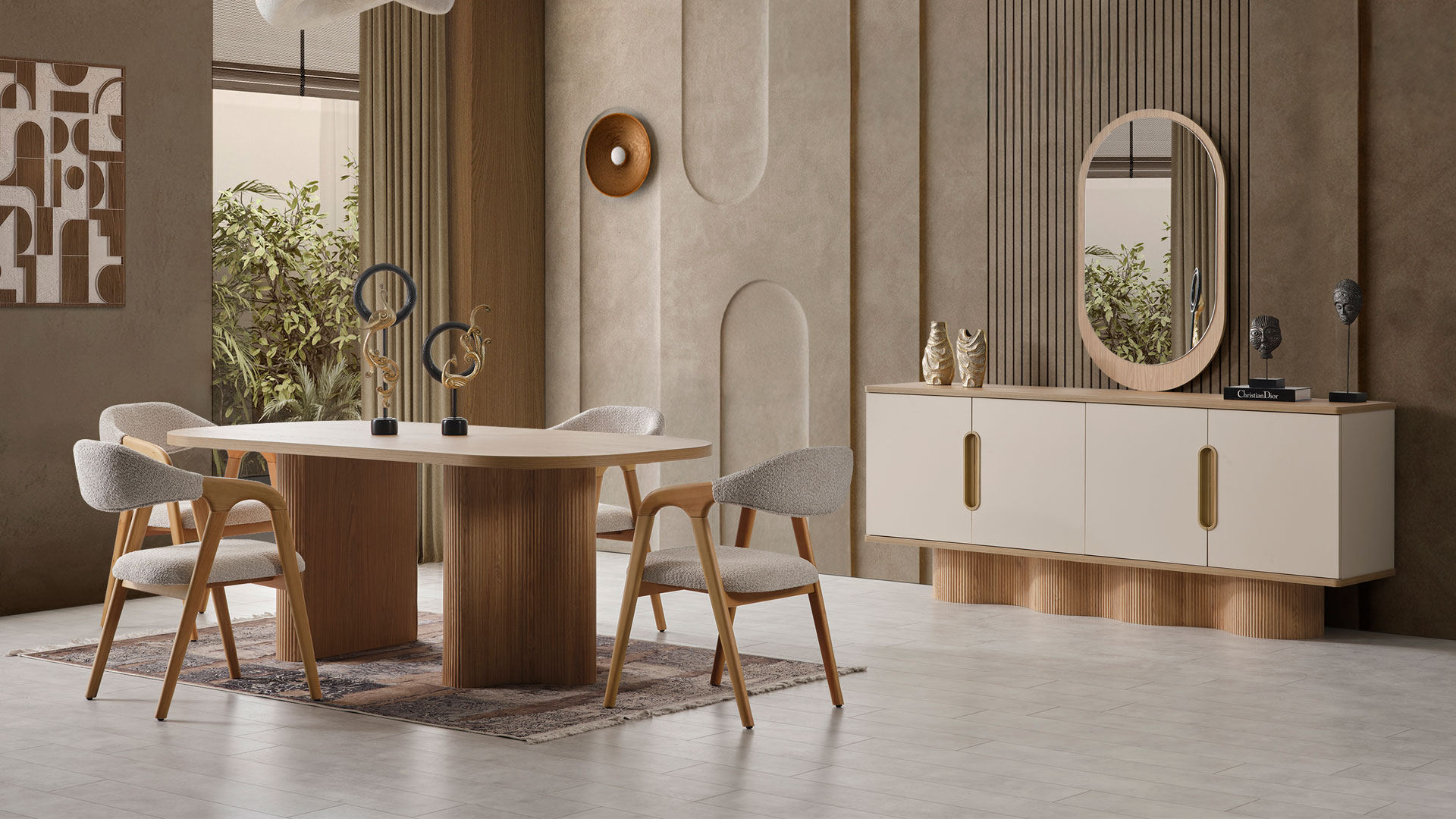 Modern ve minimalist tasarım anlayışı ile öne çıkan LİZBON YEMEK ODASI, doğal meşe ve bej renk kombinasyonuyla zarif bir atmosfer yaratıyor. Konsolda yer alan açma kapak uygulaması hem estetik hem de işlevsellik sunuyor. Sabit olmak üzere ile farklı kullanım alanlarına uyum sağlıyor.