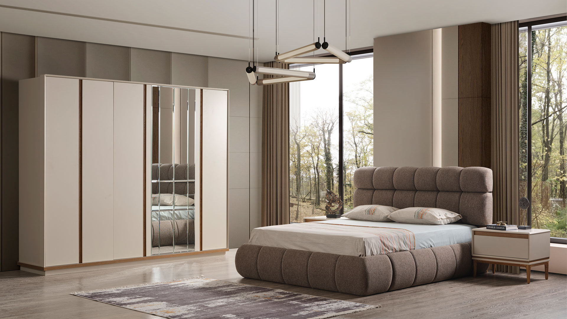Özel dikiş uygulamalı başlığı ile dikkat çeken BAHAR YATAK ODASI, tasarım detaylarıyla bulunduğu mekanlarda şık ve doğal bir atmosfer yaratıyor. Farklı ölçü alternatifleri sayesinde fonksiyonel bir kullanım sunuyor.