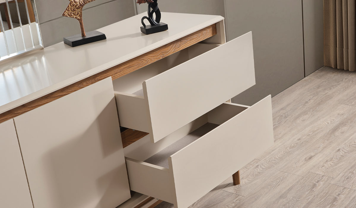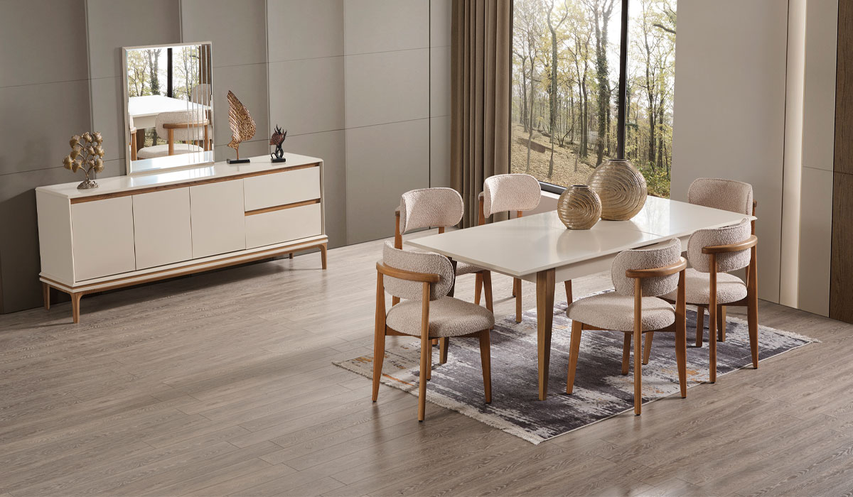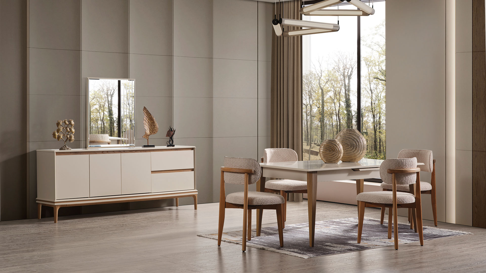 Seçkin malzeme kombinasyonlarını rafine çizgilerle buluşturan MADRİD YEMEK ODASI TAKIMI, çağdaş lüks kavramının etkileyici bir örneğini sunuyor. Renk kombinasyonunun yalın zarafetiyle yaşam alanlarında göz alıcı bir atmosfer yaratırken, konsol kapaklarında efektli görünüm ve çizgisel tasarım ile serinin şıklığını vurguluyor.