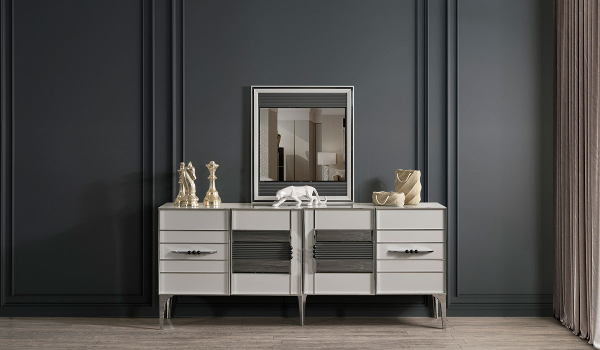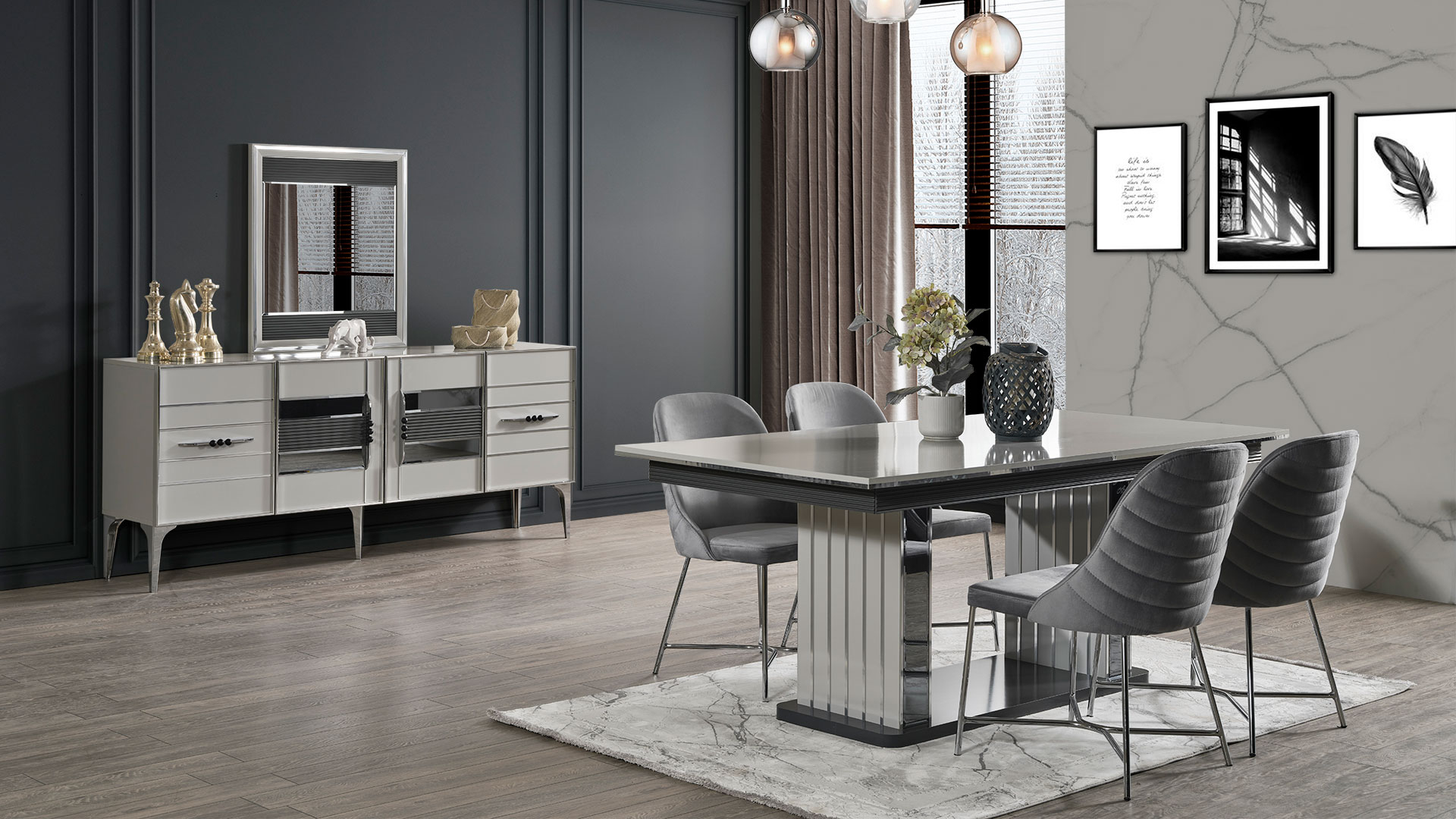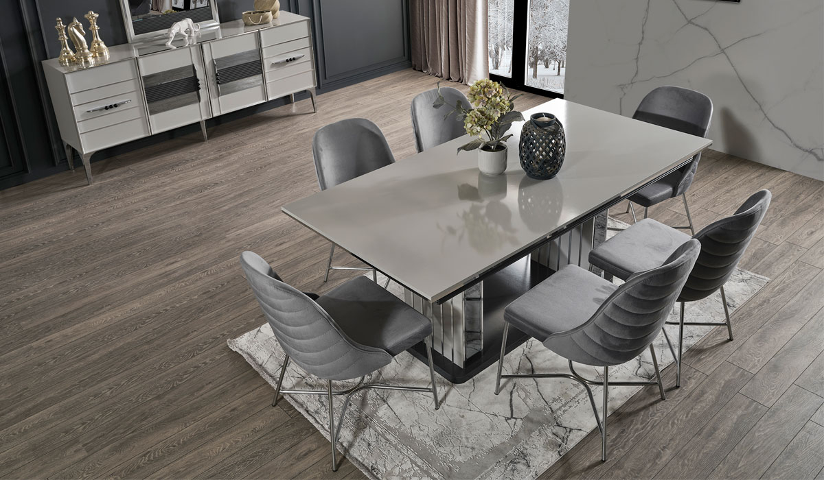MERİÇ YEMEK ODASI, çağdaş tasarımı, doğal ve yalın görünümü, işçilikli detayları ile öne çıkıyor. Renk kombinasyonunun bir arada sunulduğu MERİÇ YEMEK ODASI, tekstil dokulu yüzey detayları, kulpsuz tasarım uygulamasıyla yalın bir etki yaratan set, tasarım özgürlüğü tanıyor.