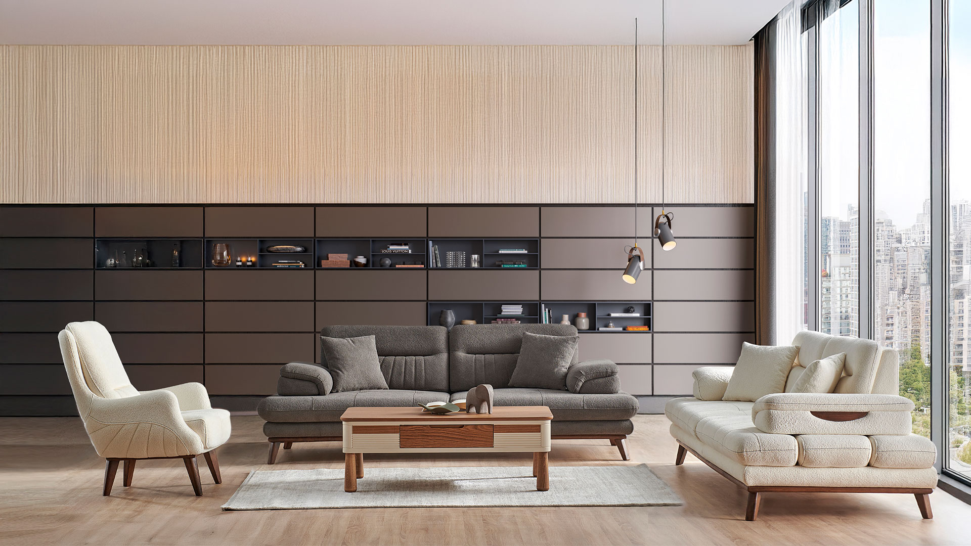 Modern tasarım çizgisini fark yaratan estetik tasarımı ile buluşturan LAVİNYA KOLTUK TAKIMI, dekorasyona rafine bir yorum getiriyor. Yüksek konforlu oturum ve sırt yapısı sayesinde yaşam alanlarındaki rahatlığı maksimum seviyeye taşıyor. 3’lü koltuk modülünün yatak olabilme özelliği ile dikkat çeken estetiğini fonksiyonellikle tamamlıyor. Şık berjer tasarımı ile zengin bir görsel duruş sergilerken, metal ayak alternatifi ile kişisel zevklere hitap ediyor.