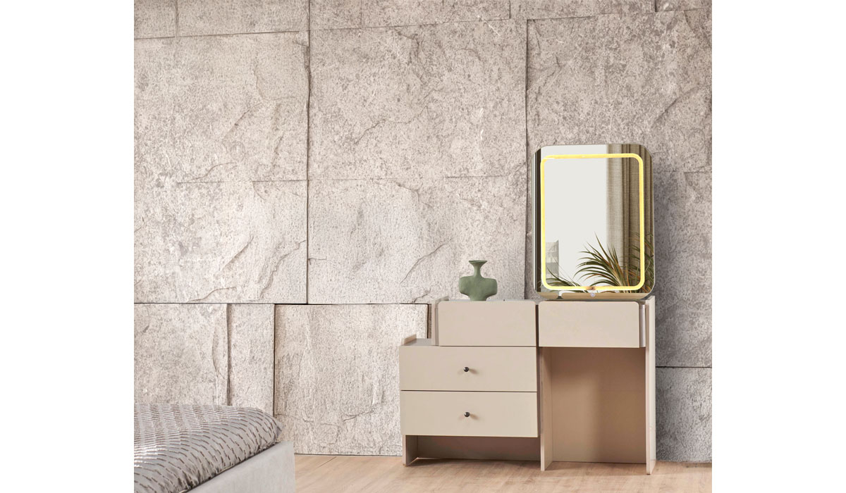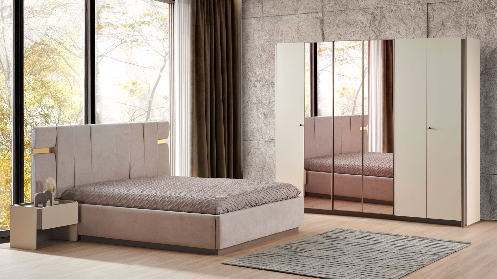 Kırık beyaz renk yüzey kombinasyonunun rafine şıklığını yansıtan LİEGE YATAK ODASI TAKIMI, modüler tasarım yaklaşımıyla estetik ve fonksiyonelliği bir araya getiriyor. Dikkat çeken yatak başlığı, dolaplarda natürel ayna uygulaması ve detaylarıyla serinin genç tasarım çizgisini yansıtıyor.