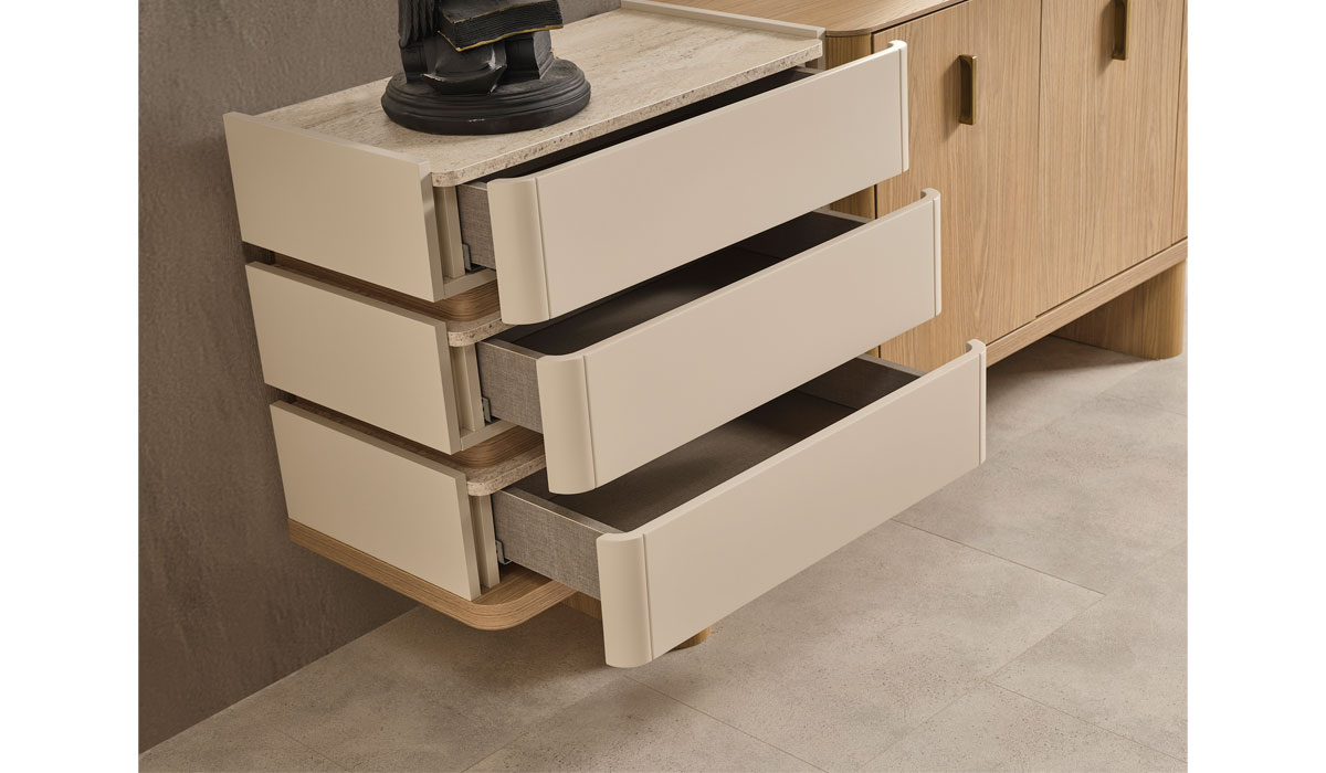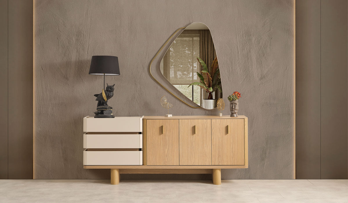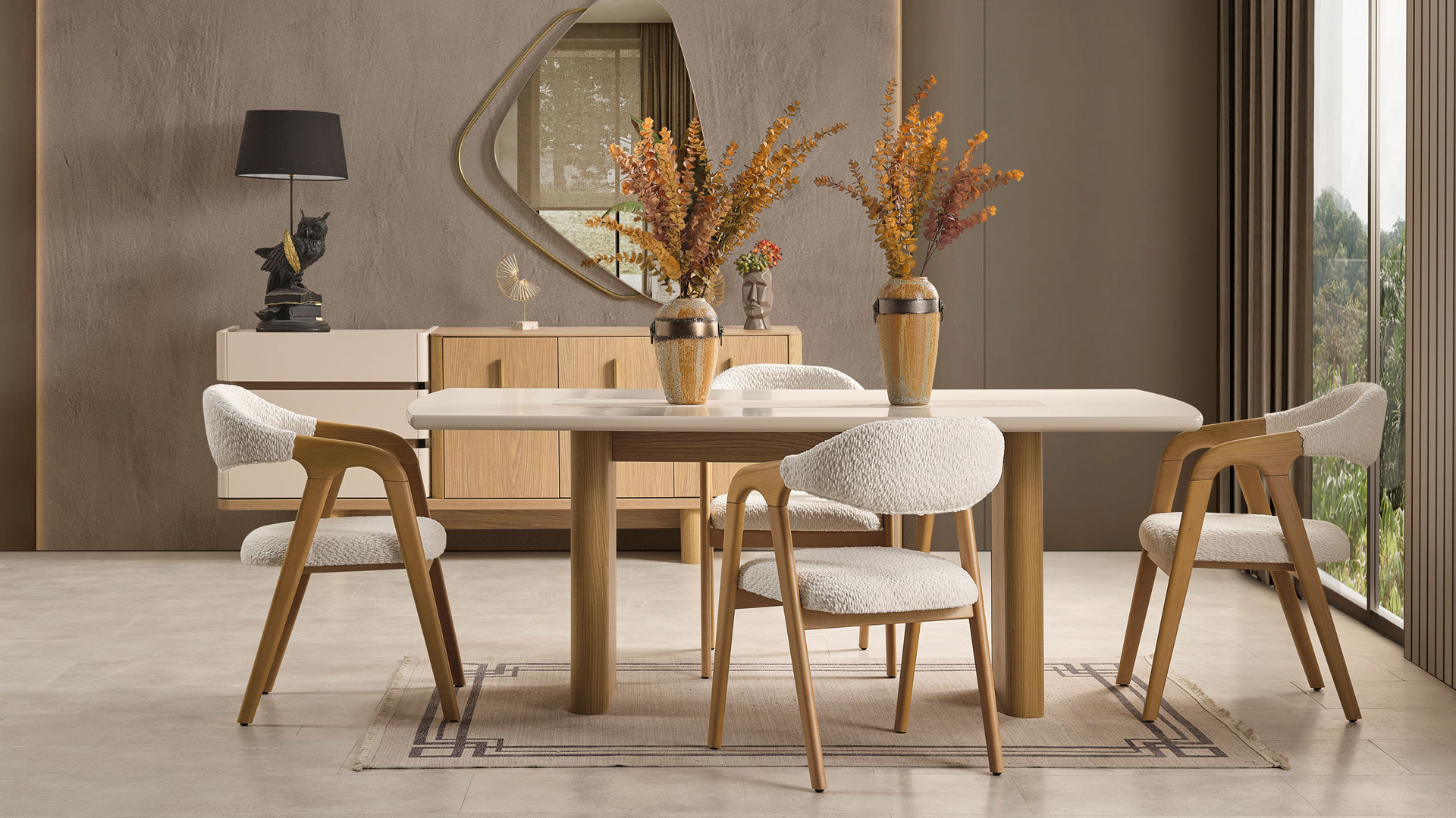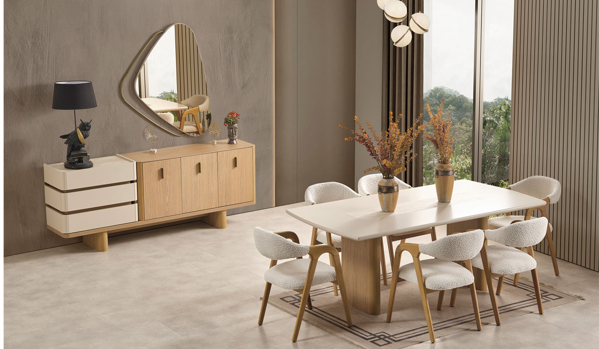 LOTUS YEMEK ODASI, çağdaş tasarımı, doğal ve yalın görünümü, işçilikli detayları ile öne çıkıyor. Meşe ve krem renk kombinasyonunun bir arada sunulduğu LOTUS YEMEK ODASI, tekstil dokulu yüzey detayları ile odanıza sıcak bir atmosfer katıyor. Kulplu ve kulpsuz tasarım uygulamasıyla yalın bir etki yaratan set, ayna alternatifi sunarak tasarım özgürlüğü tanıyor.