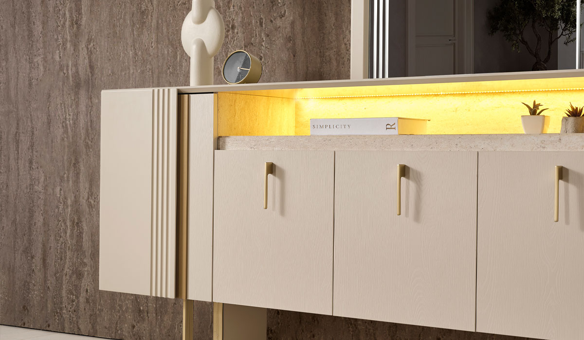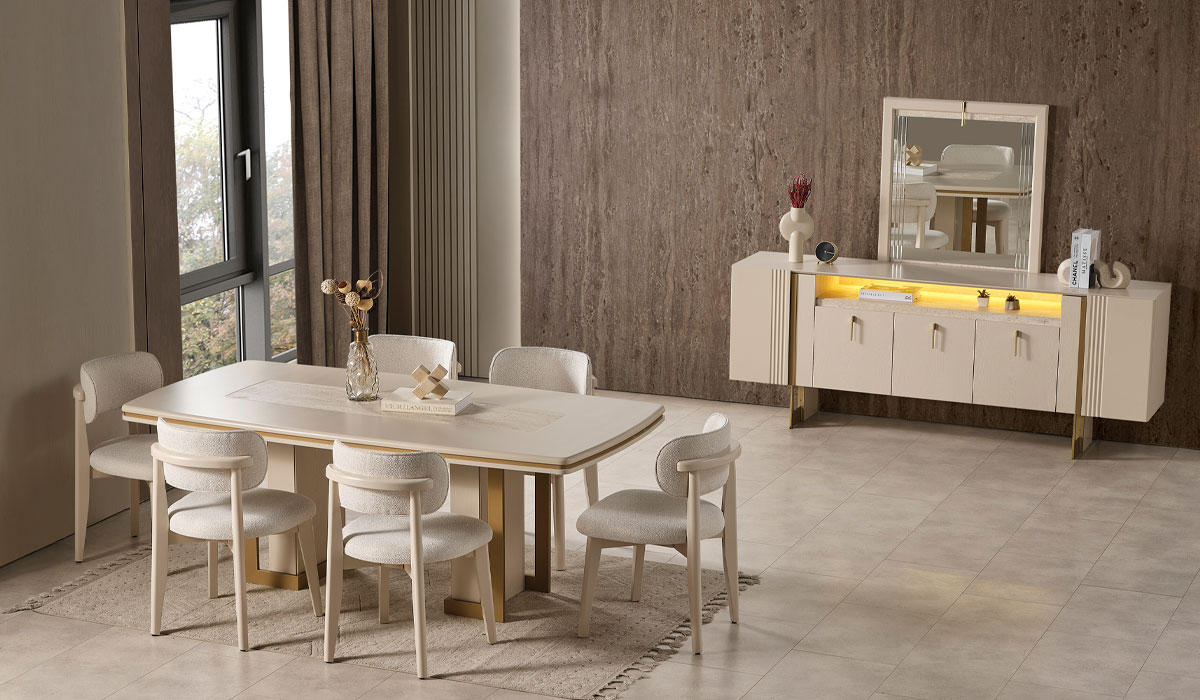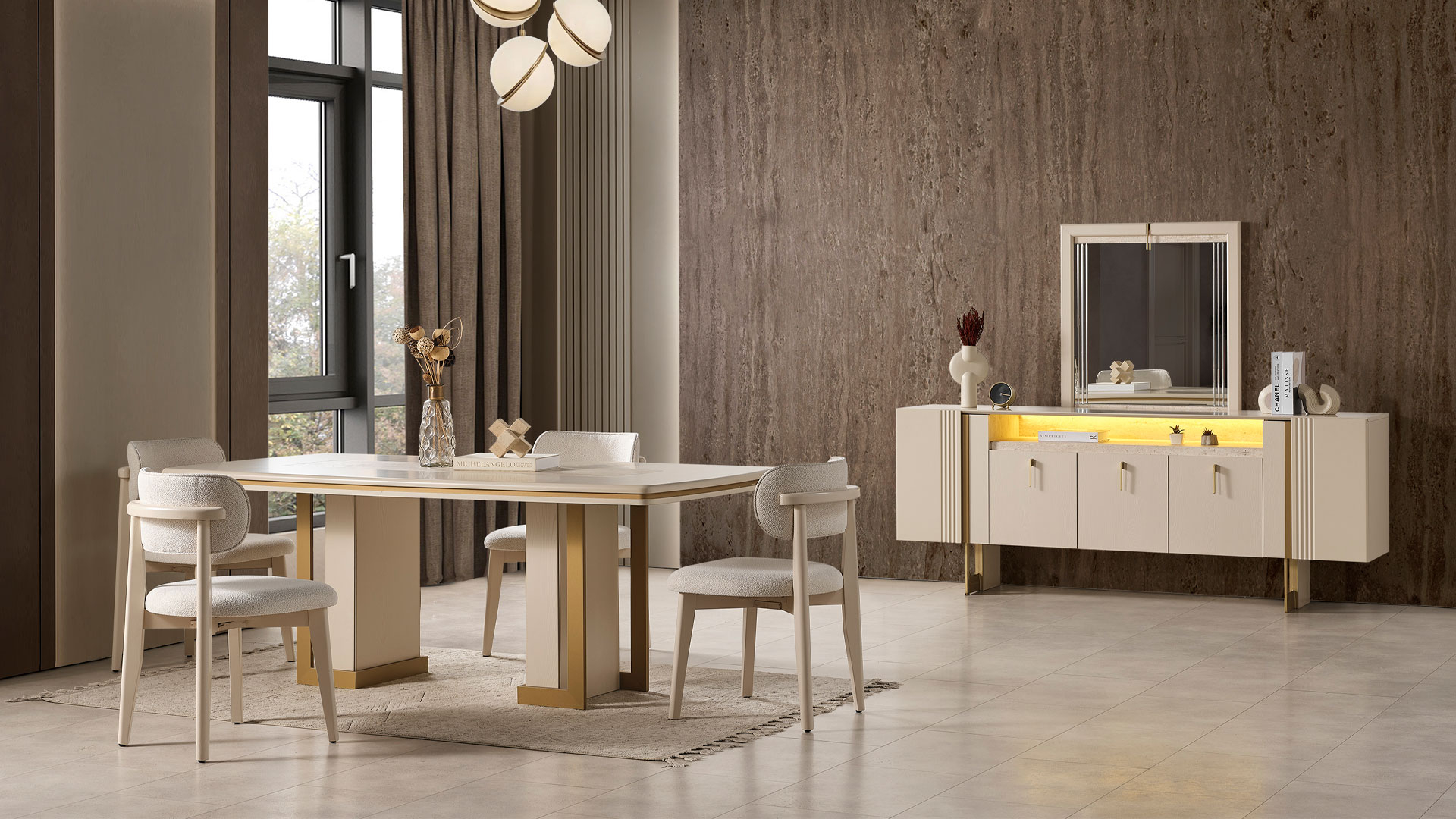 Seçkin malzeme kombinasyonlarını rafine çizgilerle buluşturan MOSS YEMEK ODASI TAKIMI, çağdaş lüks kavramının etkileyici bir örneğini sunuyor. Renk kombinasyonunun yalın zarafetiyle yaşam alanlarında göz alıcı bir atmosfer yaratırken, konsol kapaklarında efektli görünüm ve çizgisel tasarım ile serinin şıklığını vurguluyor.