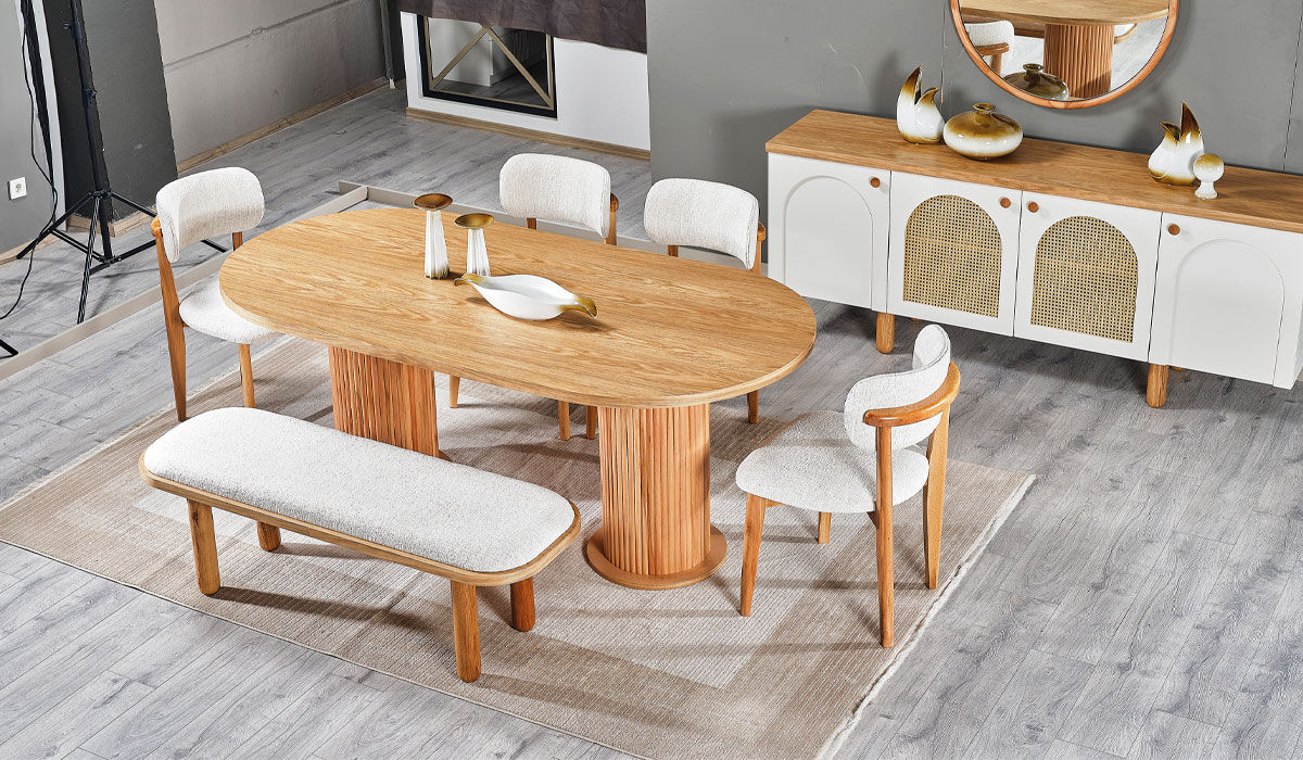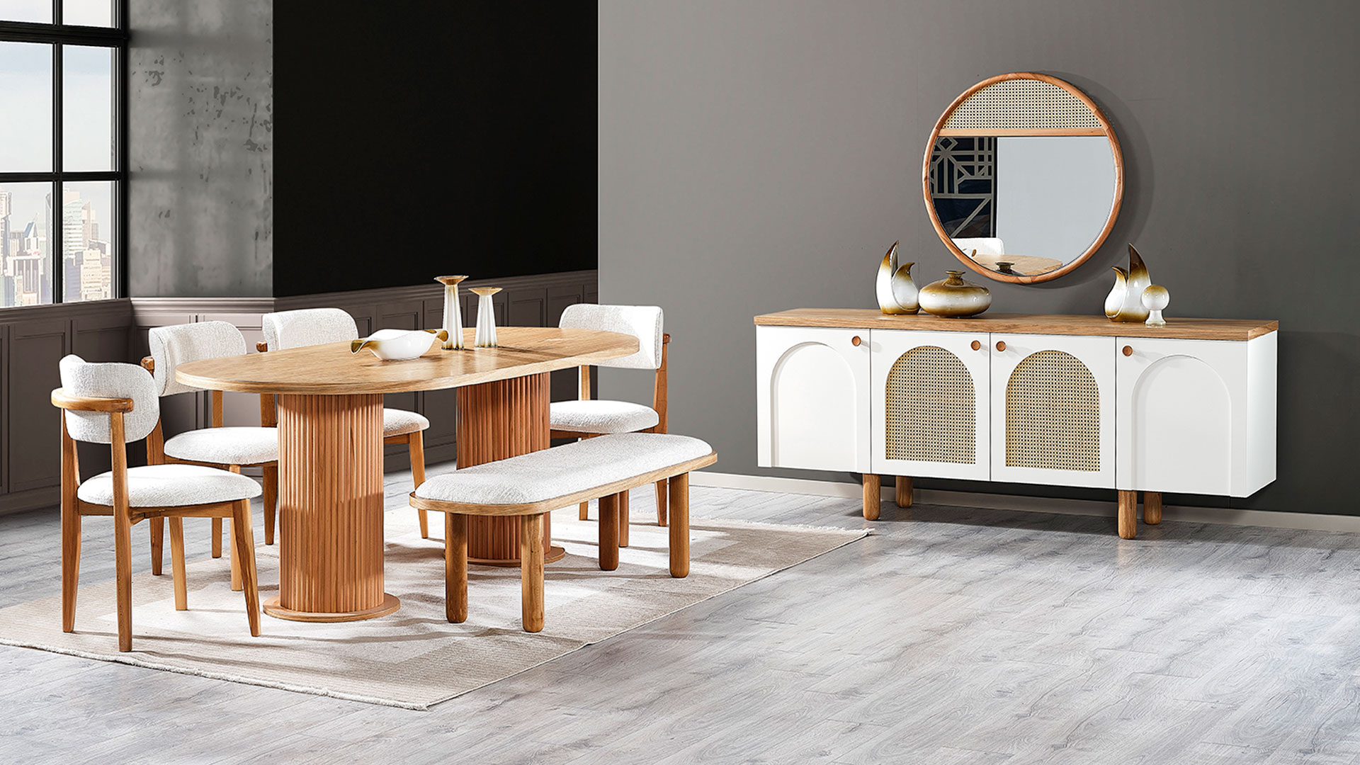 Seçkin malzeme kombinasyonlarını rafine çizgilerle buluşturan AKUA YEMEK ODASI TAKIMI, çağdaş lüks kavramının etkileyici bir örneğini sunuyor. Renk kombinasyonunun yalın zarafetiyle yaşam alanlarında göz alıcı bir atmosfer yaratırken, konsol kapaklarında efektli görünüm ve çizgisel tasarım ile serinin şıklığını vurguluyor.
