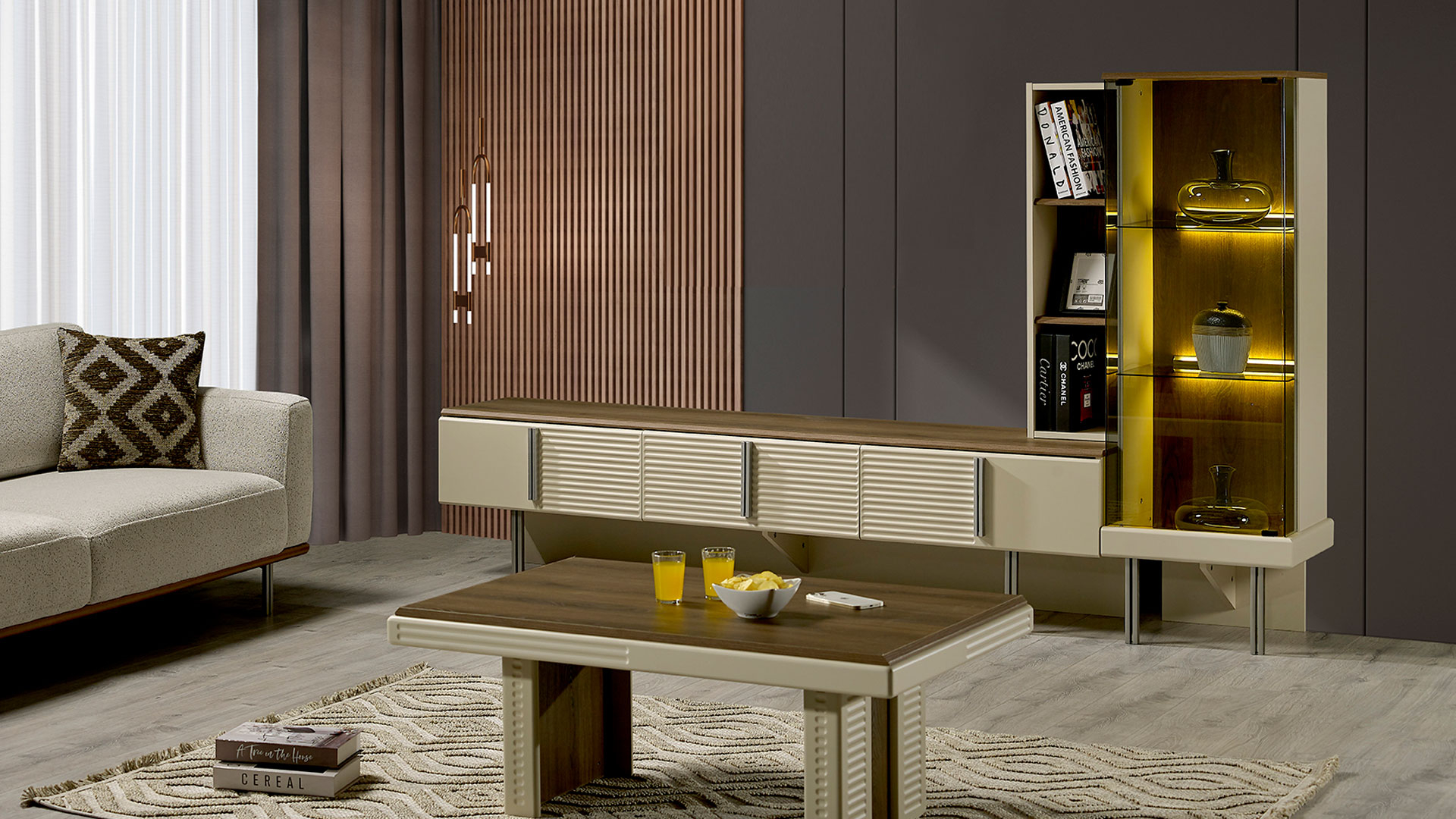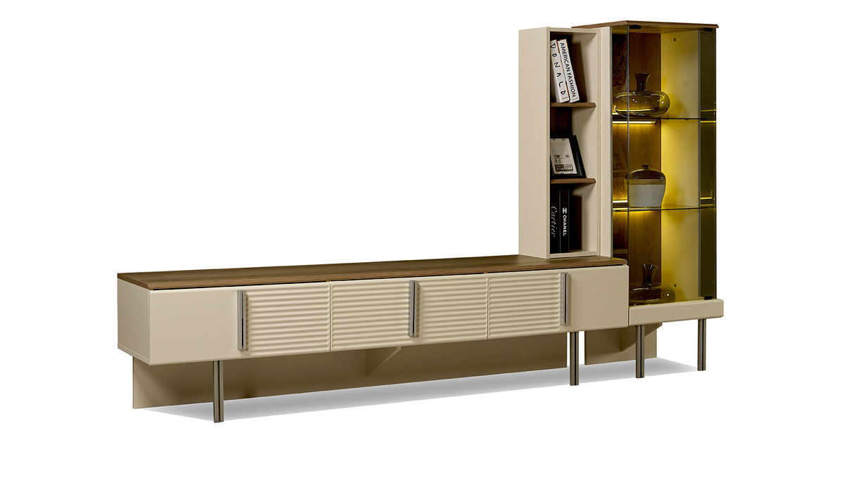 Modüller üzeri deri doku uygulamasıyla ayrıcalıklı MİNOLA TV ÜNİTESİ,