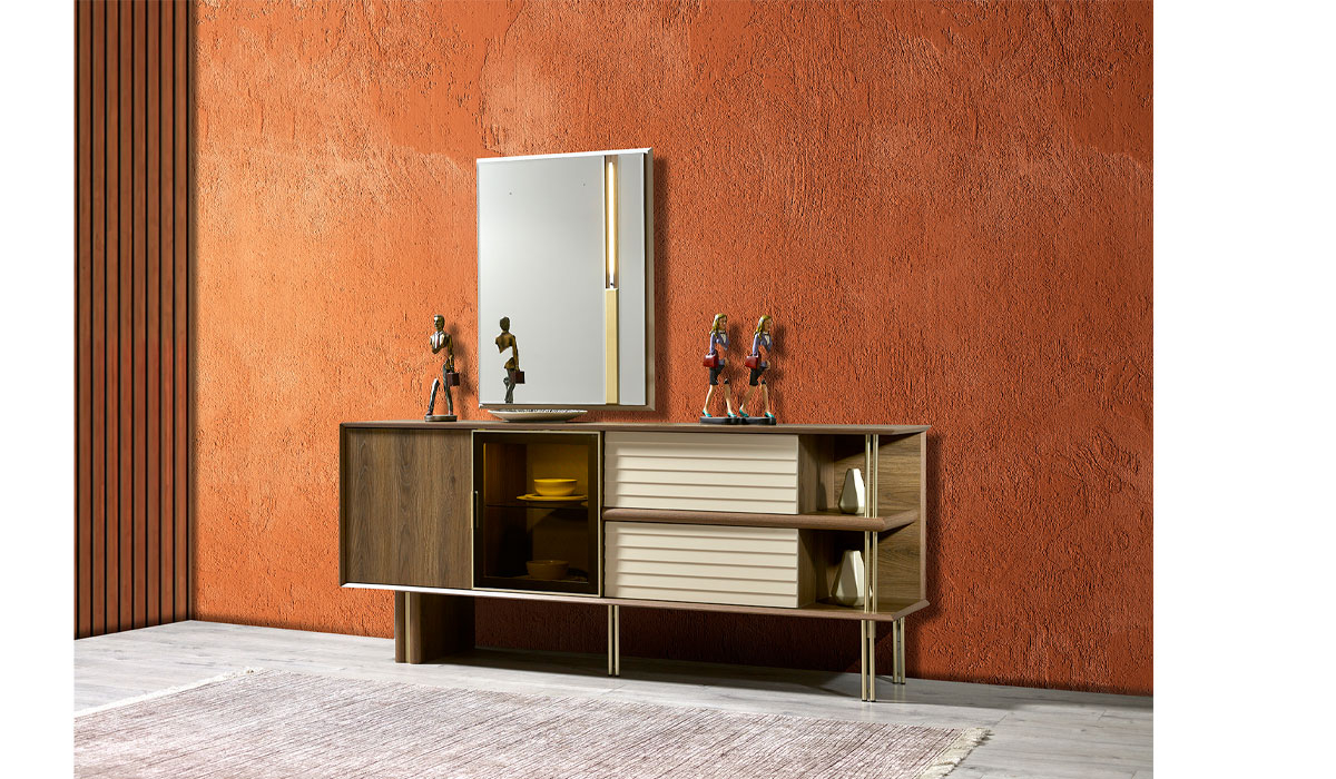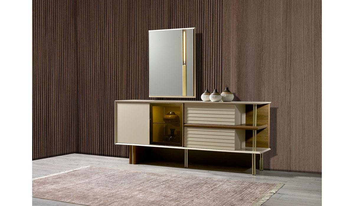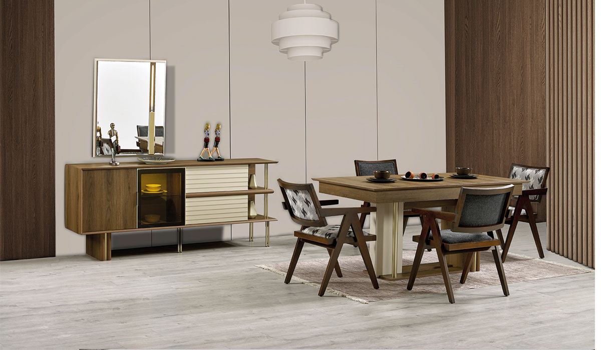 Seçkin malzeme kombinasyonlarını rafine çizgilerle buluşturan MONTANA YEMEK ODASI TAKIMI, çağdaş lüks kavramının etkileyici bir örneğini sunuyor. Renk kombinasyonunun yalın zarafetiyle yaşam alanlarında göz alıcı bir atmosfer yaratırken, konsol kapaklarında efektli görünüm ve çizgisel tasarım ile serinin şıklığını vurguluyor.